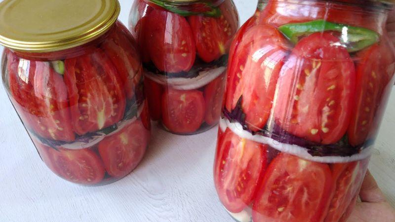 Дно стерилізованих банок наповніть трохи часником, лавровим листом і кількома помідорами і покрийте шаром цибулі. Зверху на цибулю покладіть листя свіжого базиліка і накрийте іншим шаром помідорів.