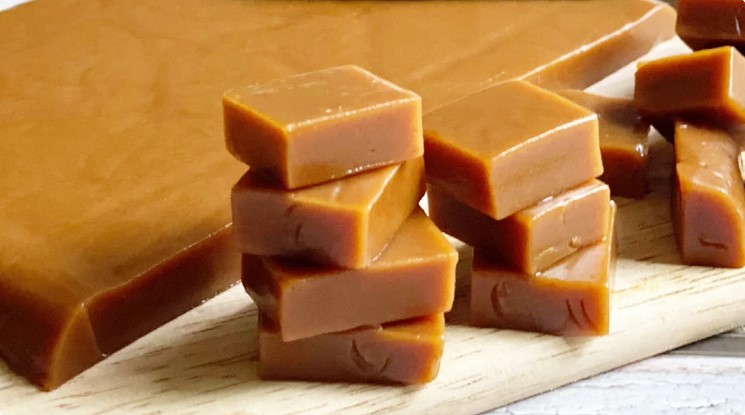 Застиглу масу звільняю від паперу і нарізаю на порційні шматочки. Щоб було зручніше різати, після того як маса застигла, я прибрала контейнер в морозилку на 10 хвилин. Готові іриски зберігаю в холодильнику.