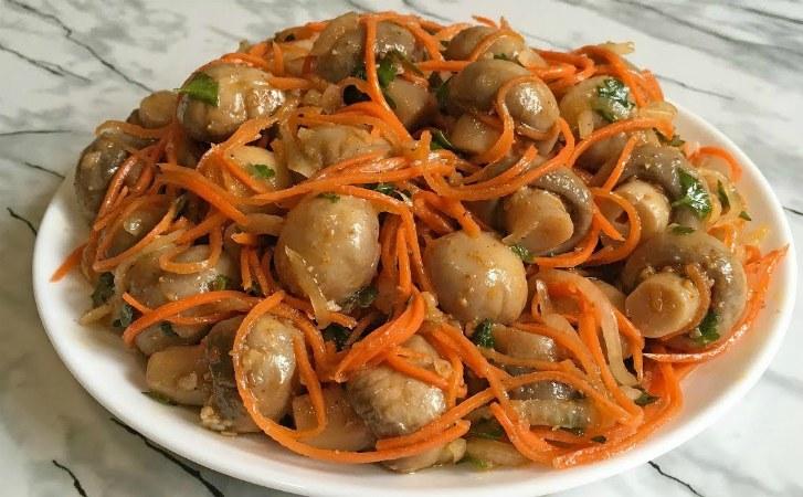 Пряний, в міру гострий салат з моркви по-корейські в більшості сімей готується дуже часто – він хоч і смачний, але вже кілька приївся. Набагато цікавіше, і відверто кажучи набагато смачніше буде приготувати за схожим рецептом гриби: спочатку відварити їх, а потім змішаємо з морквою, спеціями і цибулею.