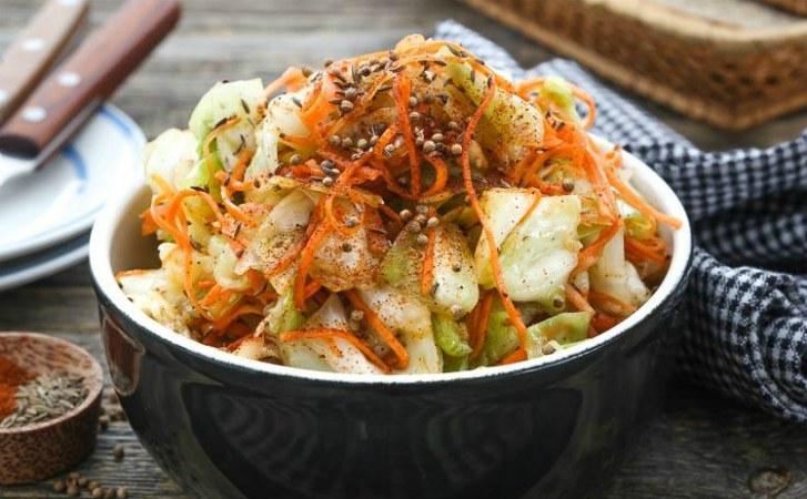 Беремо миску з капустою і морквою і в центр висипаємо коріандр, всі інші спеції і часник. І тепер прямо на спеції наливаємо розпечене цибульне олію з сковороди. Перемішуємо спеції з капустою. В останню чергу додаємо столову ложку коричневого цукру і стільки ж бальзамічного оцту. Залиште салат настоюватися, краще на ніч, і він буде повністю готовий.