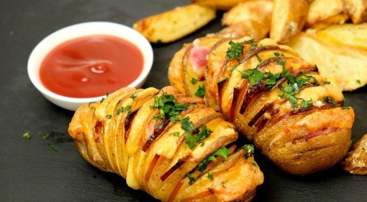 Запечена картопля найчастіше подається просто гарніром, але ми зробимо з неї справжній м’ясний делікатес. Додаємо 200 грамів сала і запекти її поштучно.