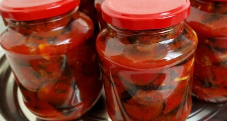 Ідея закуски під назвою «Баклажани в томаті» не нова і об’єднує велику різноманітність складу і методів приготування. У пропонованому варіанті використовуються
