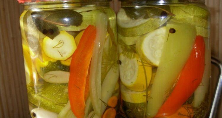 Парасольки кропу з лавровим листом доповнюють кабачки огірковим присмаком. Додайте в кожну 1 л банку кілька часточок солодкого перцю, і аромат маринованих