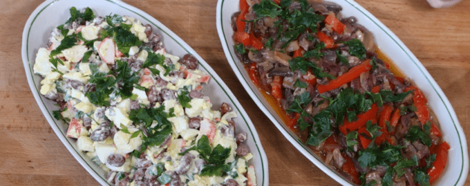 Це два простих і дуже швидких в приготуванні рецепта. Салати дуже смачні, незвичайні, оригінальні, рекомендую до святкового столу. Перший салат буде з