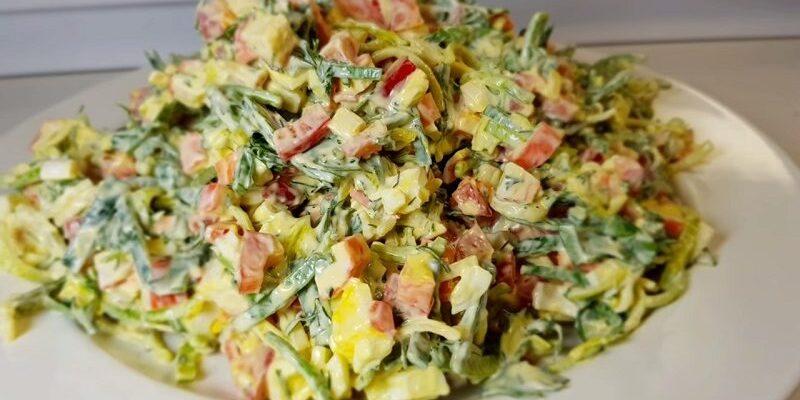 Приголомшливо смачний салат з цибулею пореєм, рецепт якого вам сьогодні пропоную, не тільки урізноманітнює повсякденне меню, але і зможе прикрасити святковий стіл.