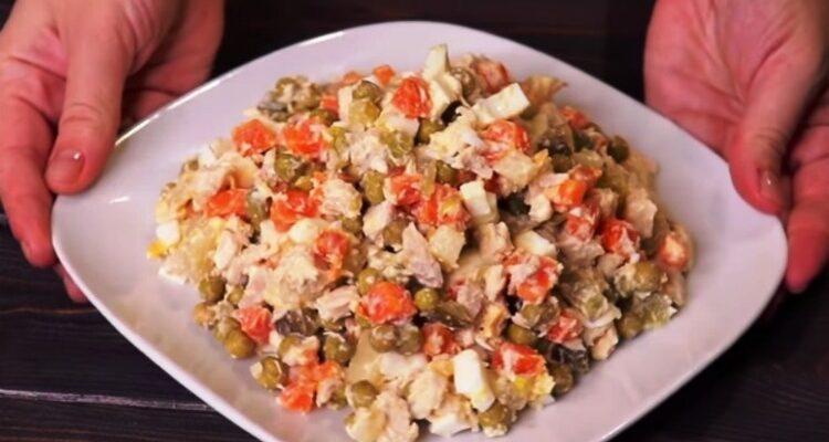 Це один з найстаріших і улюблених рецептів в нашій родині. До складу салату входить мінімум самих звичайних продуктів – м’ясо куряче, горошок, яйця.
