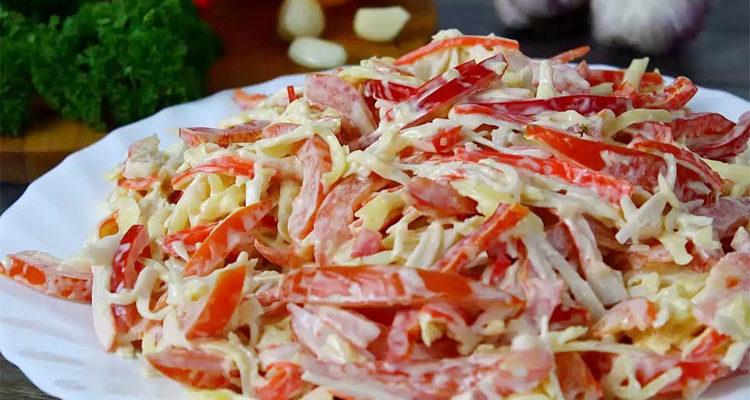 Салат Червоне море підкорює з першої ложки. Самі звичайні крабові палички виходять в ньому настільки смачні в поєднанні з болгарським перцем і помідорами