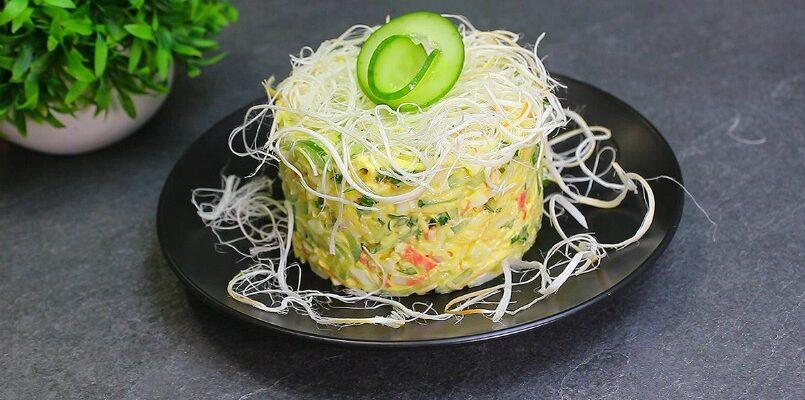 Це один з моїх улюблених крабових салатів, на святковий стіл, найчастіше, я подаю його порційно або ж просто в салатнику, прикрасивши сиром косичкою і огірками.
