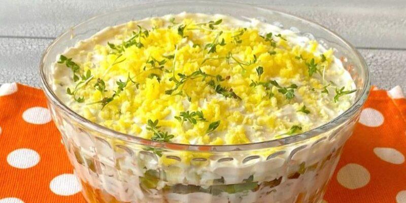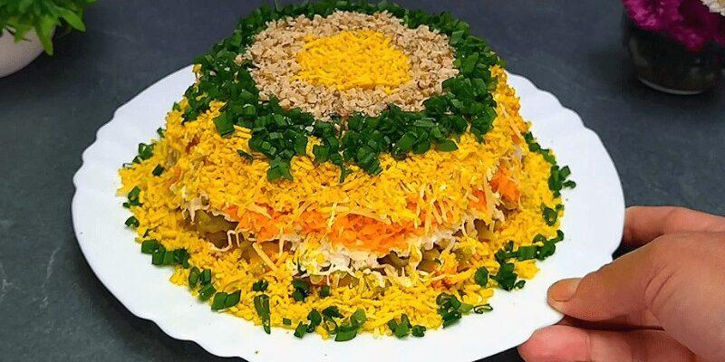 Смачний, пишний салат із простих доступних продуктів. Незважаючи на його простий склад, виглядає він на столі яскраво, та й з’їдається одним із перших.