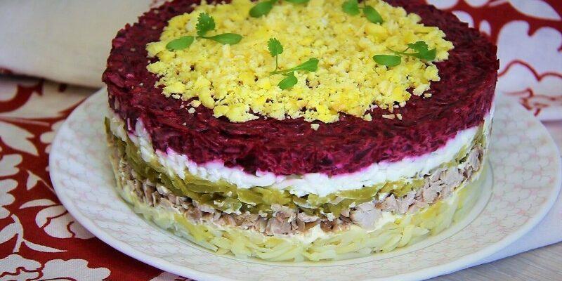 Смачно, яскраво, на кожен день або на свято! Салат готується шарами, кожен шар промазується невеликою кількістю майонезу. Можна приготувати домашній майонез.