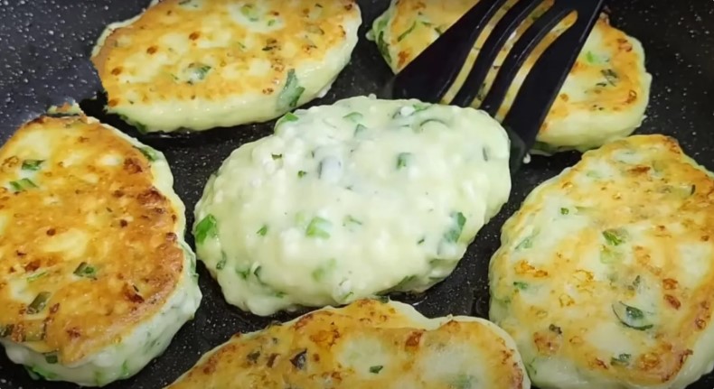 Викладаємо в тісто сир і нашаткований шпинат із зеленою цибулею, перемішуємо. У сковороді розігріваємо невелику кількість олії. Викладаємо на сковороду невеликі коржики з тіста, обсмажуємо під кришкою їх з обох боків до золотистої скоринки.