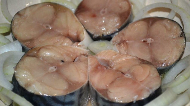 Розробляємо скумбрію: рибу спочатку промиваємо, потім відрізаємо голову і хвіст, розрізаємо черевце і видаляємо всі нутрощі, чорну плівку, відрізаємо плавники, рибу ще раз промиваємо і нарізаємо скумбрію на рівні невеликі шматочки.