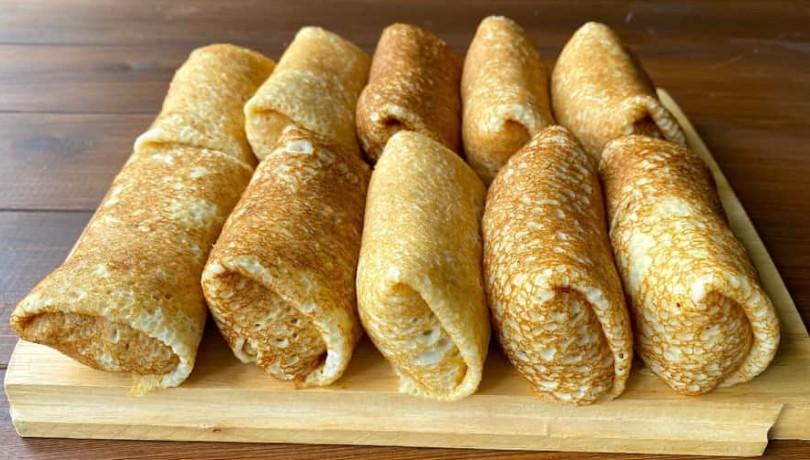 ПОРАДА! Якщо плануєте потім обсмажити млинці, кладіть начинку на рум’яну сторону. Смажити краще на вершковому маслі.