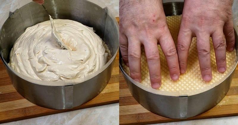 Стінки роз’ємної форми змастіть маслом, вистеліть целофаном. На дно помістіть круглий вафельний корж. На нього перелийте морозиво. Накрийте його другим коржем.