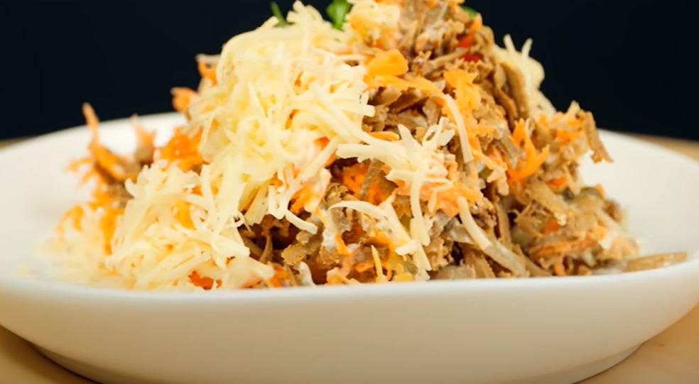 Потім додаємо шар із решти печінки, зверху викладаємо моркву. Доповнюємо кожен шар тонкої сіточкою з майонезу. Зверху присипаємо салат натертим на дрібній тертці сиром.