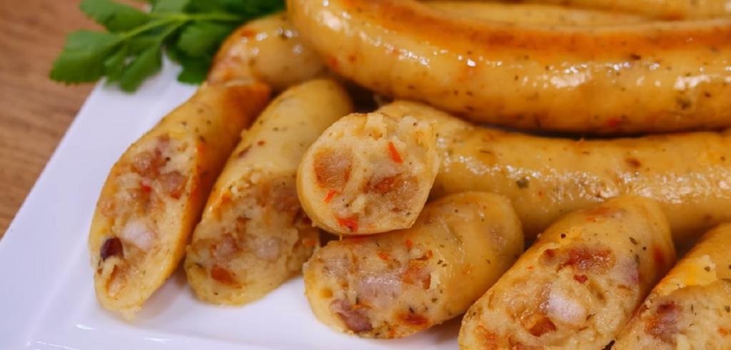 Скріплюють кінці виробів. Кладуть ковбаси в каструлю з киплячою водою. Готують близько двох хвилин. Вироби повинні придбати щільну текстуру. Після цього ковбаси поміщають на поверхню листа, покритого пергаментом і олії.