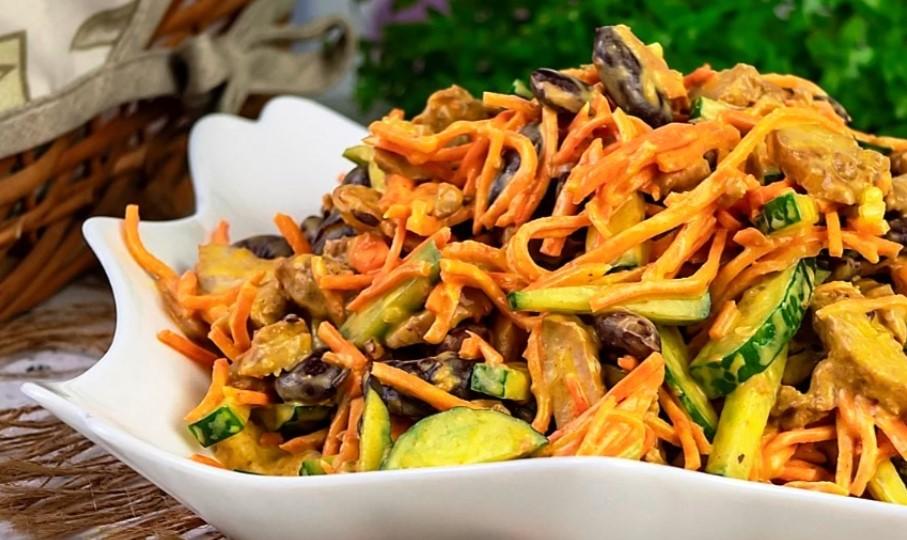 Ще для цього салату нам знадобиться морква по-корейськи, подрібнити ножем, інакше це буде важко їсти. Відправимо в миску.