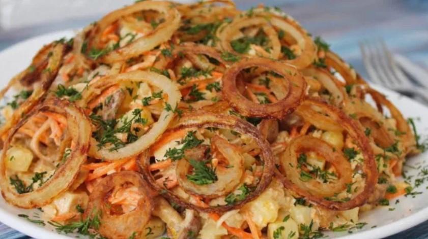 Салат готується з морквою по-корейськи, м’ясом і грибами. Родзинкою страви є ріпчаста цибуля, який потрібно обваляти в борошні і обсмажити. Приготування не займе багато часу, але салат приємно здивує своїм і видом, і смаком.