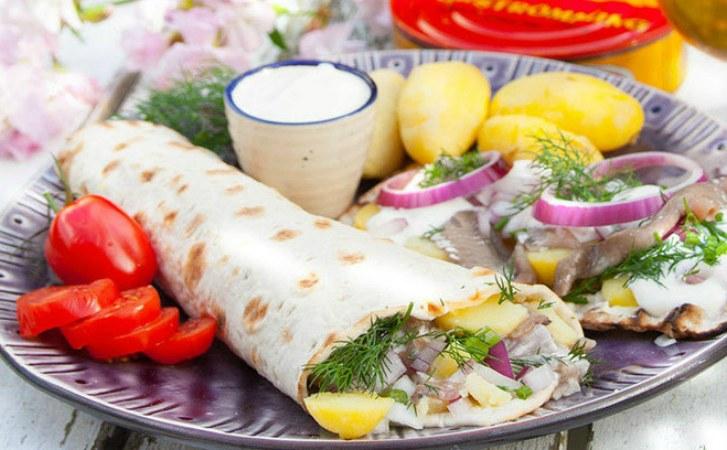 На лаваш намазується тонким шаром масло, зверху кладуть салат, потім часточку яйця, слідом оселедець – на неї можна за бажанням витиснути трохи часнику. Акуратно згорніть лаваш і бутерброд готовий.
