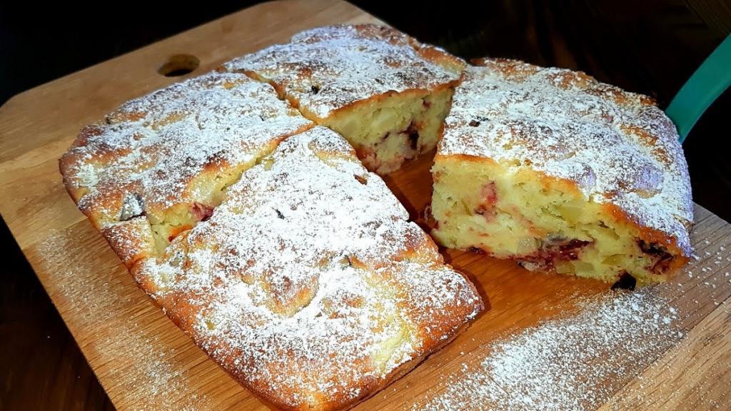Даю пирога трохи охолонути прямо в формі, потім виймаю його і чекаю, поки він повністю охолоне. Присипаю зверху цукровою пудрою і нарізаю на шматочки.