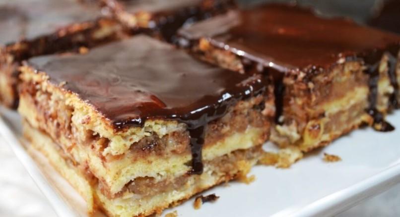 Десерт виходить дуже м’яким, просоченим і ароматним. Яблучна начинка перетворюється в бурштиновий мед, який відмінно поєднується з шоколадною помадкою зверху.