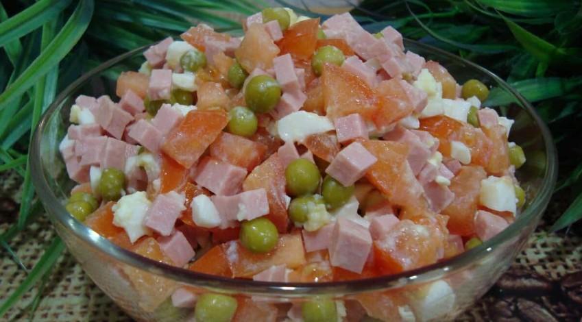 Сьогодні хочу поділити з Вами рецептом салату з ковбаси з помідорами, горошком і яйцем. Такий салат готується досить просто і швидко. Всього лише за лічені хвилини відварюю курячі яйця, нарізаю всі інгредієнти кубиками і заправляю салат олією.