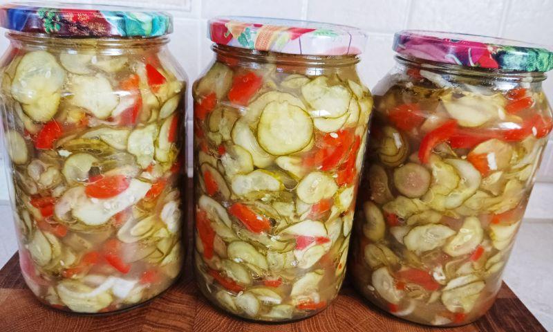 Салат періодично перемішую. Овочі пустять сік, який буде майже врівень із поверхнею овочів. Розкладаю овочі в стерильні банки, прикриваю кришками прокип’яченими, ставлю в широку каструлю з серветкою на дні.