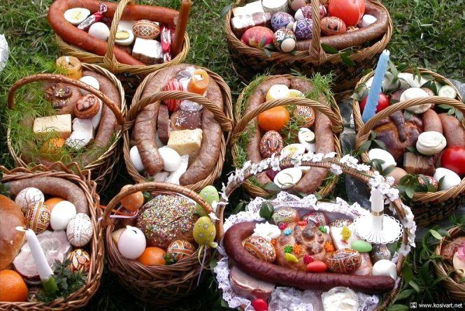 Для святкування Великодня у кожній домівці готують великодній кошик, в якому мають бути певні продукти. Кожен з цих продуктів має символічне значення. Великодній кошик, наповнений наїдками, прикрашають зазвичай бушпаном чи барвінком, вкривають вишитим рушником і освячують в церкві.