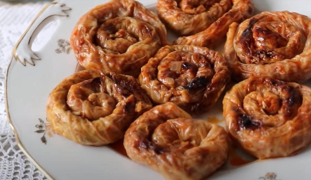 Викладіть капустяний лист, потім покладіть начинку тонкою лінією, загорніть спочатку як млинець, а потім в равлика. Таким чином, ми готуємо кожен шматок, а потім кладемо равликів поруч один з одним в форму для запікання або на тарілку з більш високою кромкою.