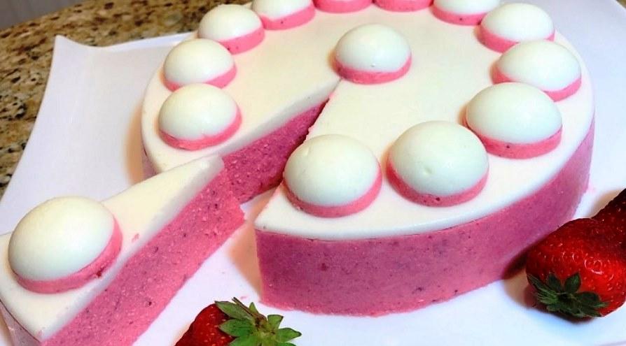 Десерт ставимо в холодильник: можна на кілька годин, але буде ще смачніше, якщо залишити його в холоді на цілу ніч. Виймаємо десерт, перевертаємо форму на плоску тарілку і прикрашаємо часточками полуниці.
