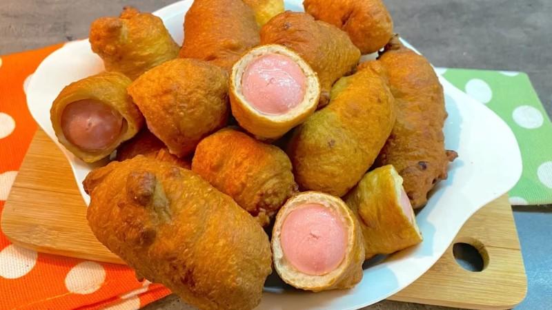 Отже, опустила заготовку в киплячу олію та обсмажила до рум’яності. За бажанням можна зняти з палички сосиски у тісті, щоб вони вільно плавали та рівномірно просмажувалися.