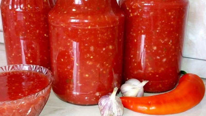 Подрібнені помідори можна консервувати на зиму у вигляді соусу з часником, гострим перцем та іншими інгредієнтами.