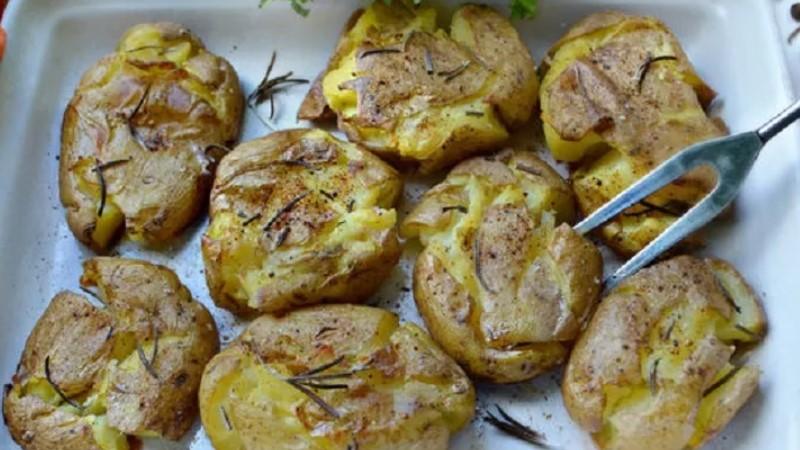 Придавіть трохи кожну картоплину, тільки не перестарайтеся. Ще раз змастіть кожну оливковою олією і присипте подрібненим розмарином. Можна використовувати і інші ароматні трави.