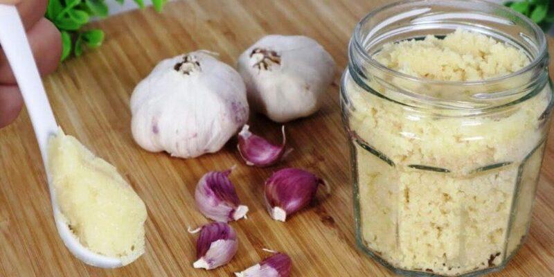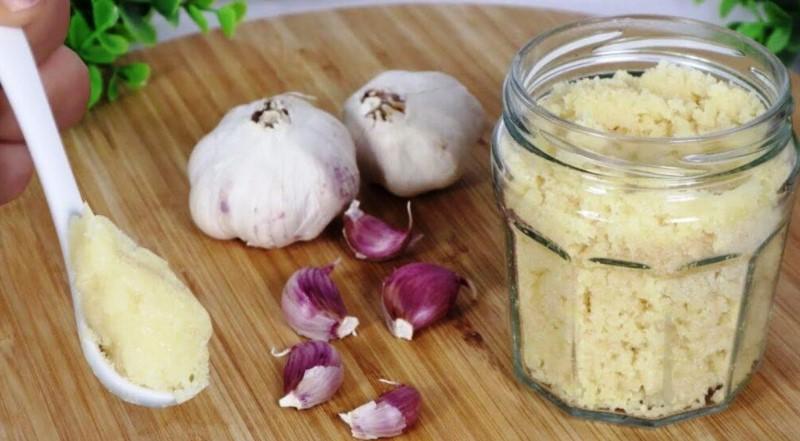 Половину від загальної кількості додаємо в блендер, посипаємо 20 г солі. Засипаємо в блендер залишки часнику, посипаємо ще сіллю і подрібнюємо до кашки.