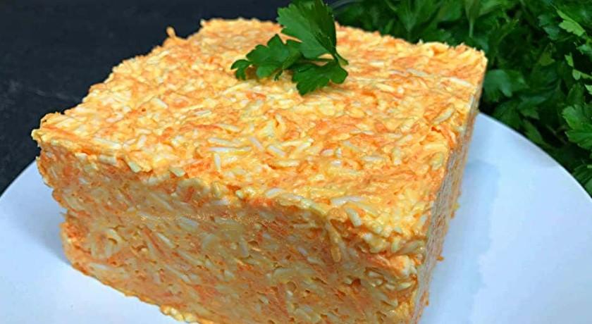 Мию, чищу моркву і натираю її на дрібній терці разом з плавленим сирком. Але не втомлюся вам повторювати, що для салату найкраще використовувати саме сир, а не сирний продукт. І якщо є можливість, то сир перед тим, як натерти на терці найкраще трохи потримати в морозилці. Тоді його набагато простіше буде подрібнювати.