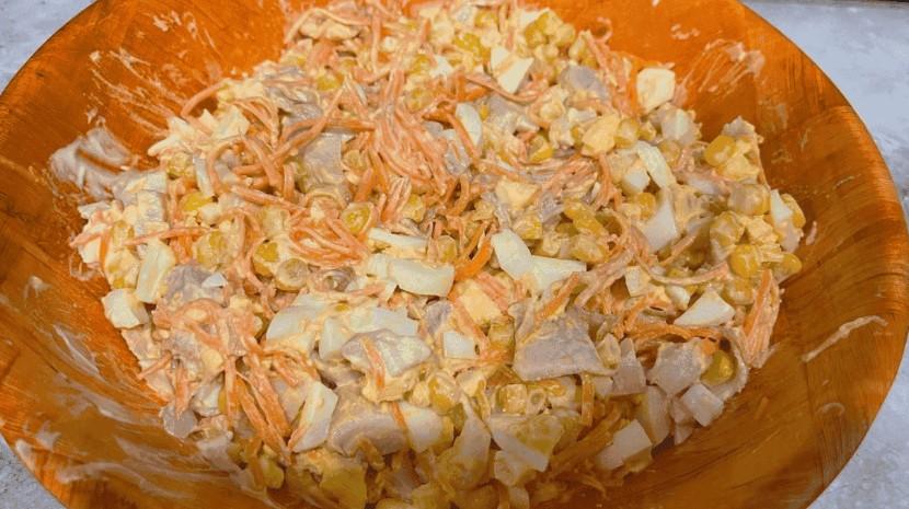 4) Морквину по-корейськи віджимаємо руками від зайвого соку і відправляємо в салатницю до курки, кукурудзи та яєць. Перемішуємо.