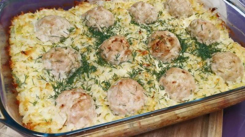 Цибулю дрібно ріжемо і змішуємо з курячим фаршем, солимо і перчимо, додаємо спеції за смаком. Фарш добре вимішуємо. Формуємо фрикадельки і викладаємо їх в масу у формі, робимо спочатку невеликі поглиблення.