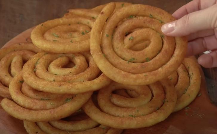 Велику тарілку закуски на весь вечір можна приготувати за лічені хвилини. Просто закрутимо пюре в кільця і обсмажити у великій кількості соняшникова олії, а подаємо з різними соусами.